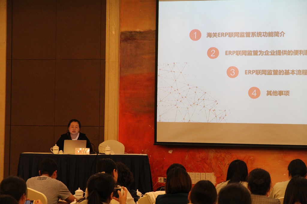芜湖海关综合业务二科主任科员恽慧根据培训内容安排,对合肥海关试行推广的ERP联网监管系统功能、适用范围、基本流程、为企业可提供的便利、企业准入条件等进行了具体阐释。