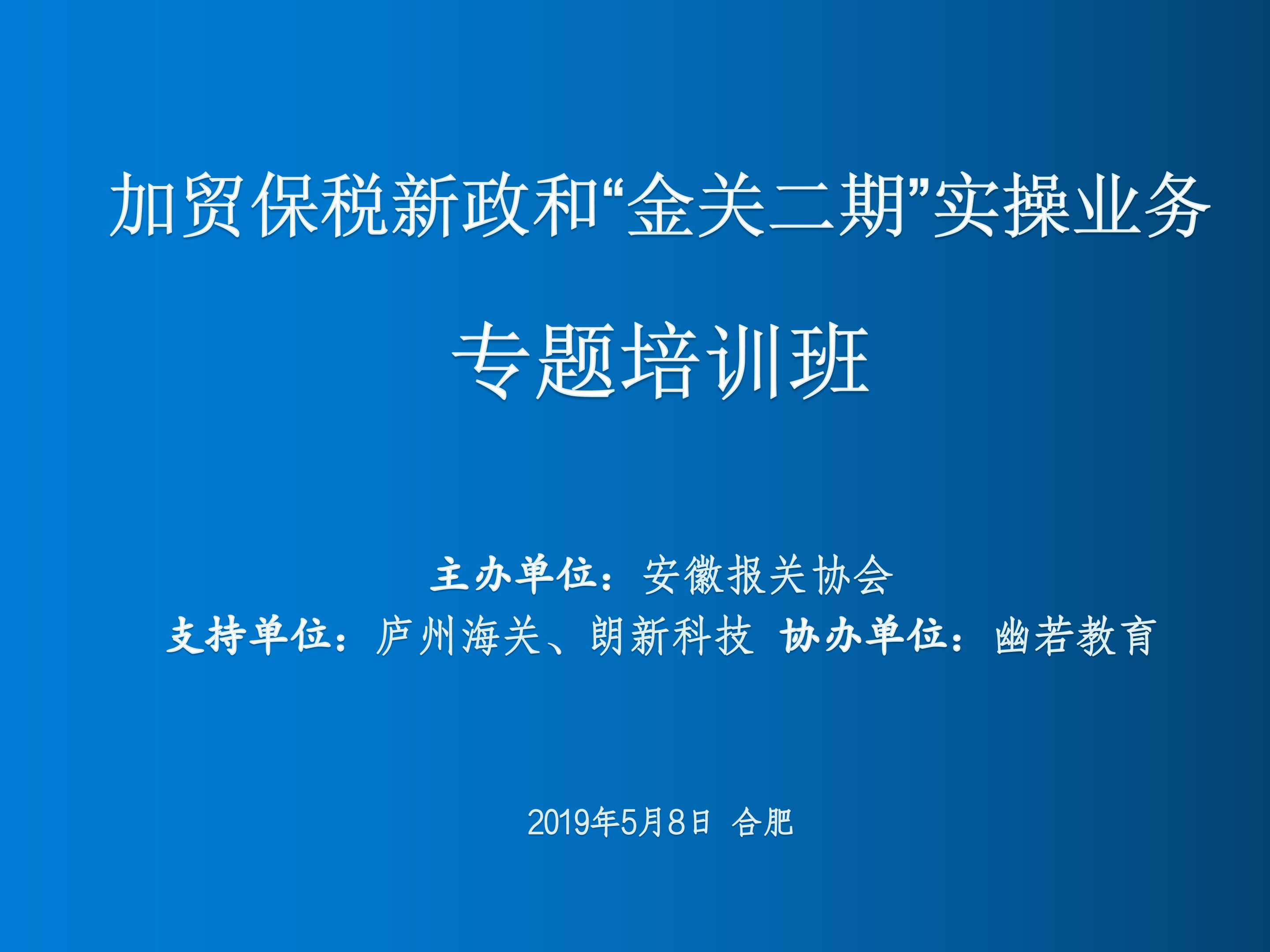 为帮助企业了解海关加工贸易和保税管理新的政策规定,促进加工贸易、保税物流等相关企业发展,顺应海关推进通关改革、科技信息化发展和加快智慧通关的时代要求,保证“金关二期”将于8月1日全面正式进行顺利切换,5月8日,安徽报关协会在合肥举办“海关加贸保税新政和‘金关二期’实操业务专题培训班”,特邀庐州海关保税监管科科长王幼萍、中国海关“单一窗口”建设专家(中国报关协会智慧通关服务平台技术专家)陈燕涛分别讲解加工贸易和保税监管最新政策规定、“金关二期”系统设置与操作等课程。