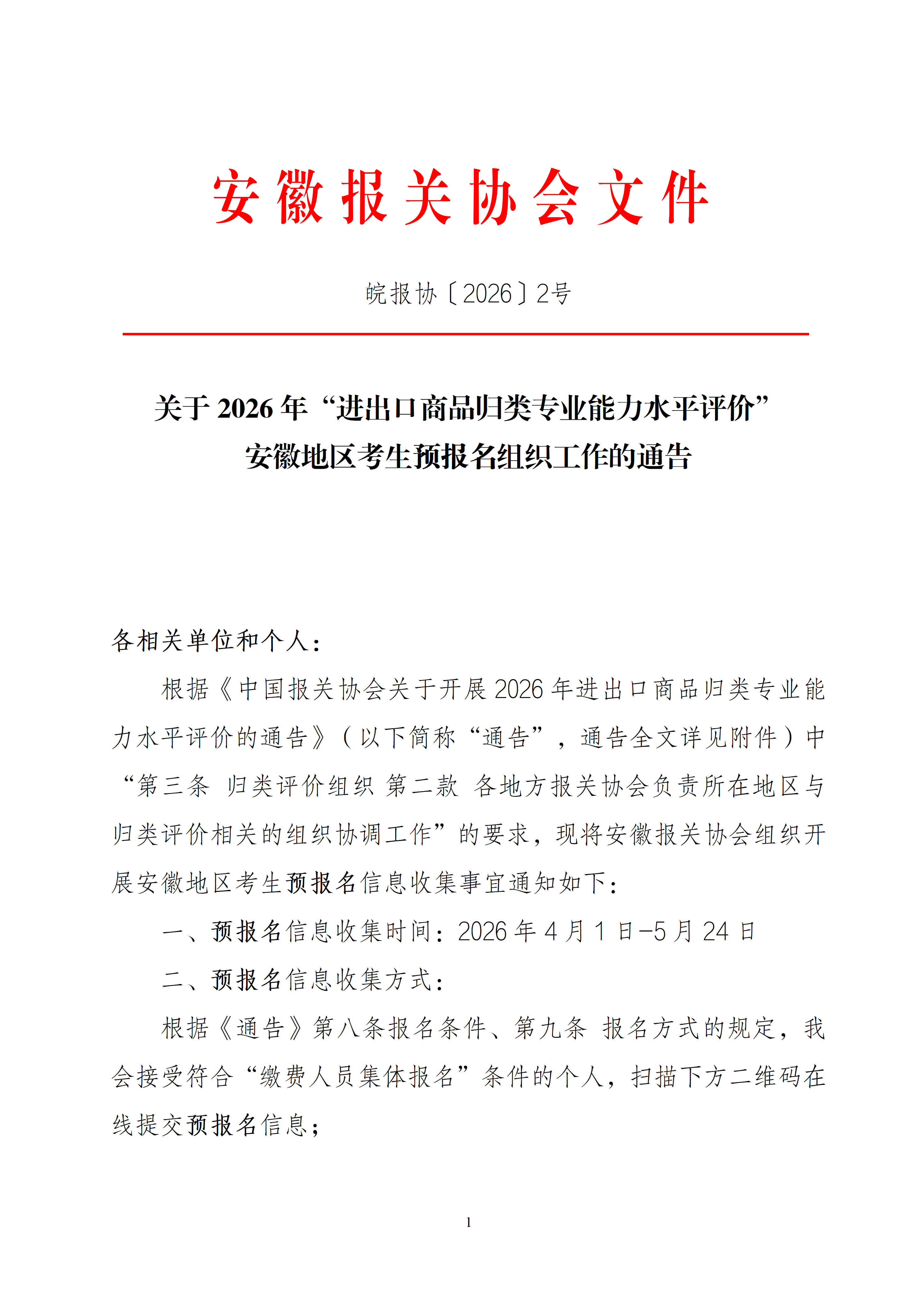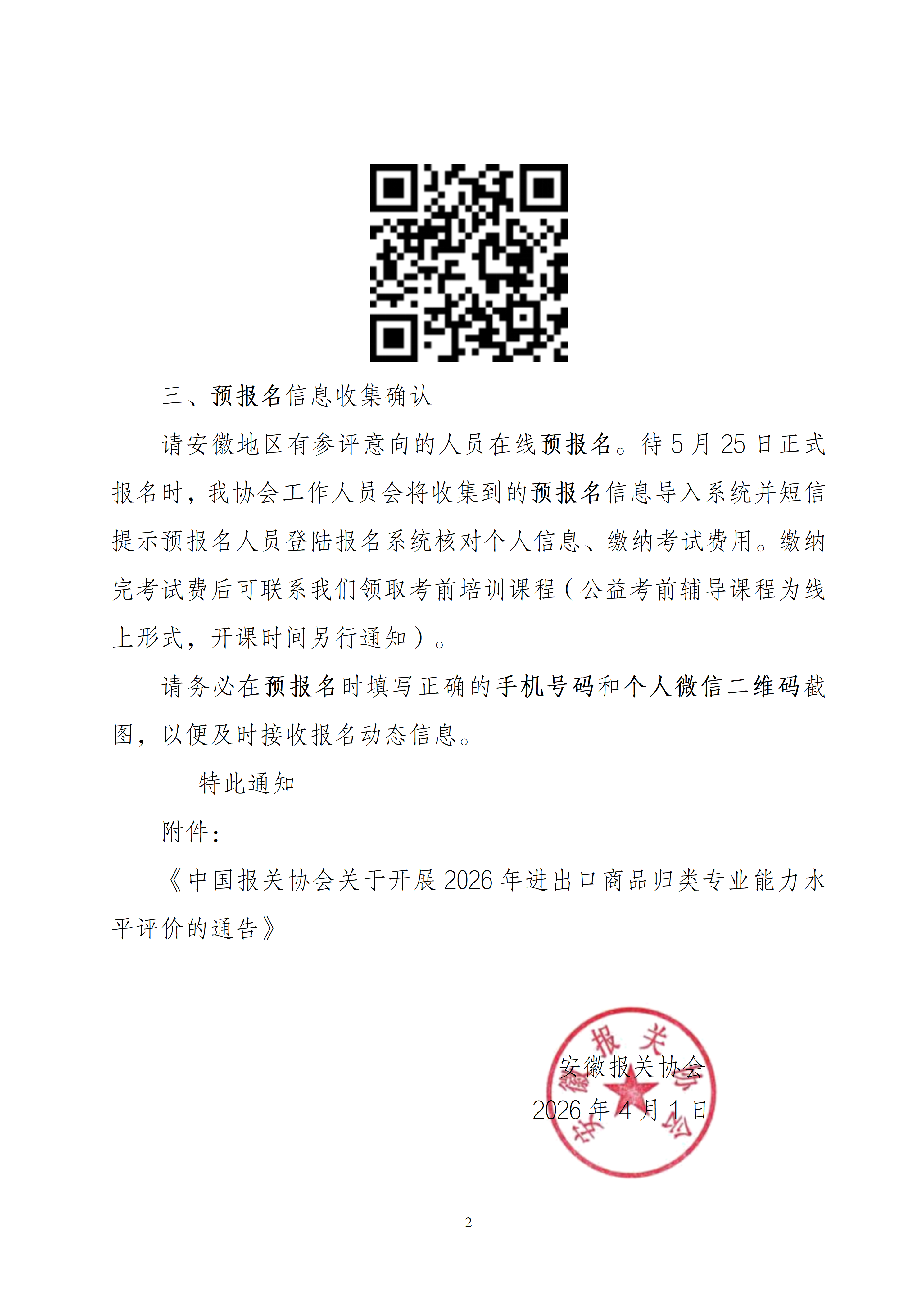 2、《中国报关协会关于开展2026年进出口商品归类专业能力水平评价的通告》全文下载:/upload/file/20260402/20260402104897059705.zip