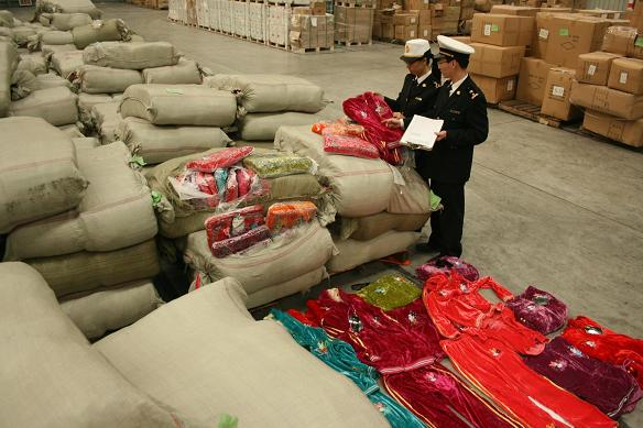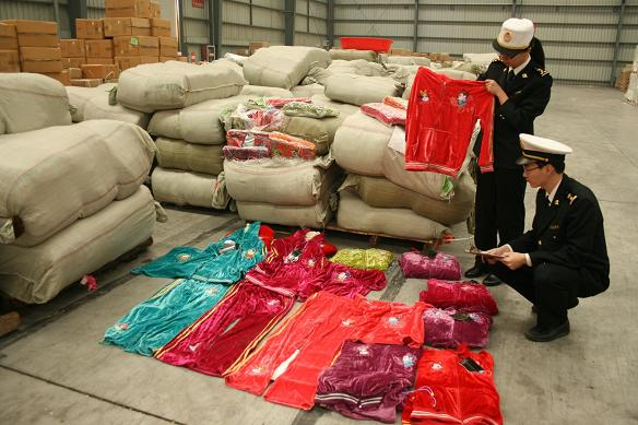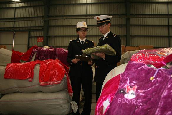 图为:宁波海关查验关员在对查获的涉嫌侵犯“Minnie Mouse device”商标权的化纤针织女套装进行清点 楼千里/摄