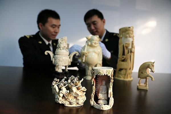 图为:威海海关关员正在清点查获的象牙制品 朱鹤/摄