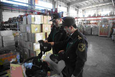 图为:侵犯巴西世界杯标识知识产权帽子 刘坤/摄 图为:北京海关关员对涉嫌侵权商品进行开箱查验 刘坤/摄