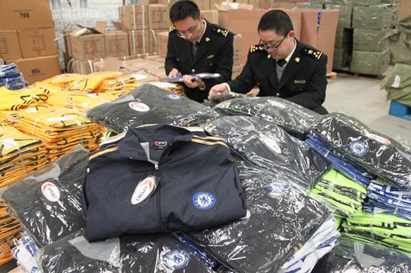 图为:海关关员查获的涉嫌侵权球衣 曹永胜/摄