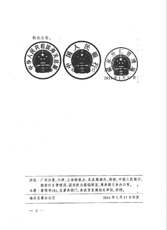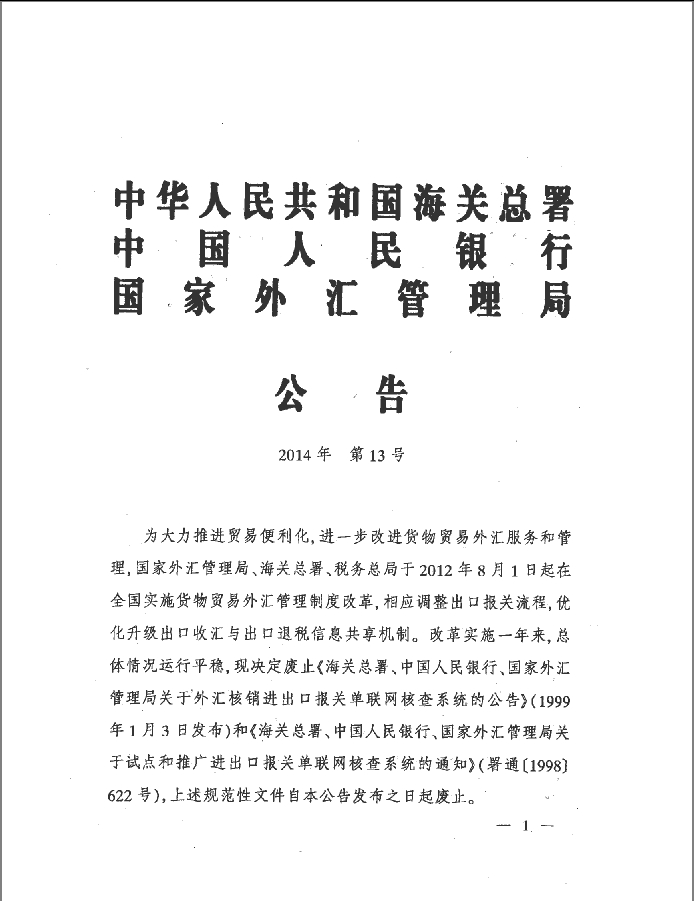 海关总署、央行、外汇管理局联合公告2014第13号