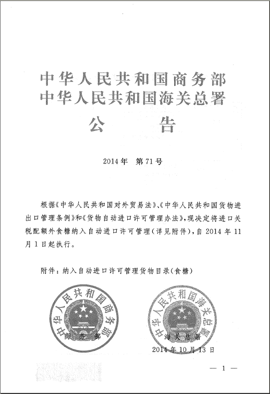海关总署、商务部联合公告2014第71号