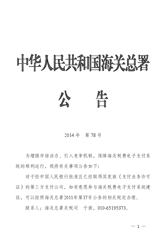 海关总署2014年第78号公告(关于办理海关税费电子支付的公告)