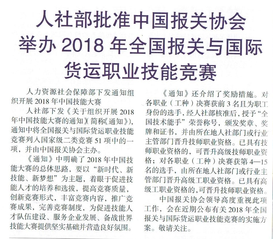 人社部批准中国报关协会举办2018年全国报关与国际货运职业技能大赛